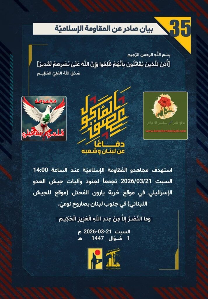 أصدرت المقاومة الاسلامية بعد البيان رقم “34” مباشرة بيان رقم “35” :”دفاعًا عن لبنان وشعبه، استهدف مجاهدو المُقاومة الإسلاميّة عند الساعة 14:00 السبت 21/03/2026 تجمعاً لجنود وآليات جيش العدو الإسرائيلي في موقع خربة يارون المُحتل (موقع للجيش اللبناني) في جنوب لبنان بصاروخ نوعيّ.