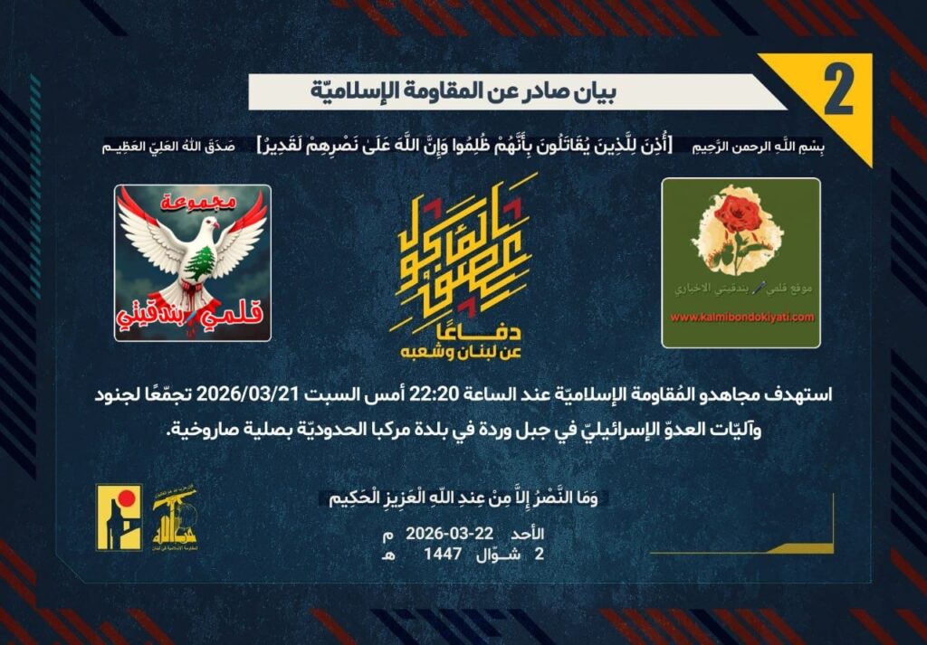 أصدرت المقاومة الاسلامية بعد البيان رقم “1” مباشرة بيان رقم “2” :”دفاعًا عن لبنان وشعبه، استهدف مجاهدو المُقاومة الإسلاميّة عند الساعة 22:20 أمس السبت 21/03/2026 تجمّعًا لجنود وآليّات العدوّ الإسرائيليّ في جبل وردة في بلدة مركبا الحدوديّة بصلية صاروخية.