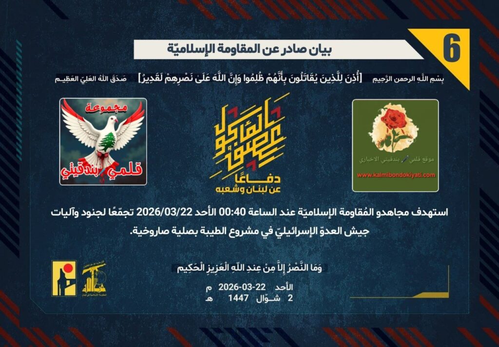 أصدرت المقاومة الاسلامية بعد البيان رقم “5” مباشرة بيان رقم “6” :”دفاعًا عن لبنان وشعبه، استهدف مجاهدو المُقاومة الإسلاميّة عند الساعة 00:40 الأحد 22/03/2026 تجمّعًا لجنود وآليات جيش العدوّ الإسرائيليّ في مشروع الطيبة بصلية صاروخية.