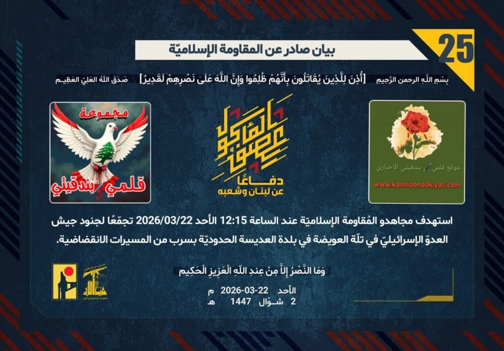 أصدرت المقاومة الاسلامية بعد البيان رقم ’24’ مباشرة بيان رقم’25’ :”دفاعًا عن لبنان وشعبه، استهدف مجاهدو المُقاومة الإسلاميّة عند الساعة 12:15 الأحد 22/03/2026 تجمّعًا لجنود جيش العدوّ الإسرائيليّ في تلّة العويضة في بلدة العديسة الحدوديّة بسرب من المسيرات الانقضاضية.