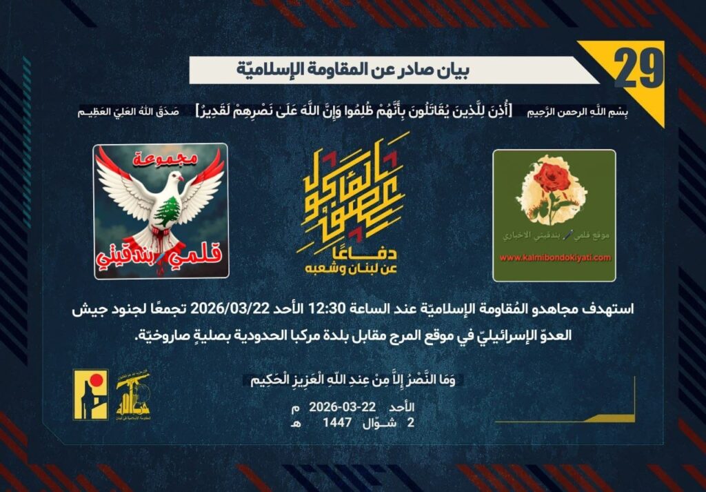 دفاعًاأصدرت المقاومة الاسلامية بعد البيان رقم مباشرة’28’ بيان رقم’29’ :” عن لبنان وشعبه، استهدف مجاهدو المُقاومة الإسلاميّة عند الساعة 12:30 الأحد 22/03/2026 تجمعًا لجنود جيش العدوّ الإسرائيليّ في موقع المرج مقابل بلدة مركبا الحدودية بصليةٍ صاروخيّة.