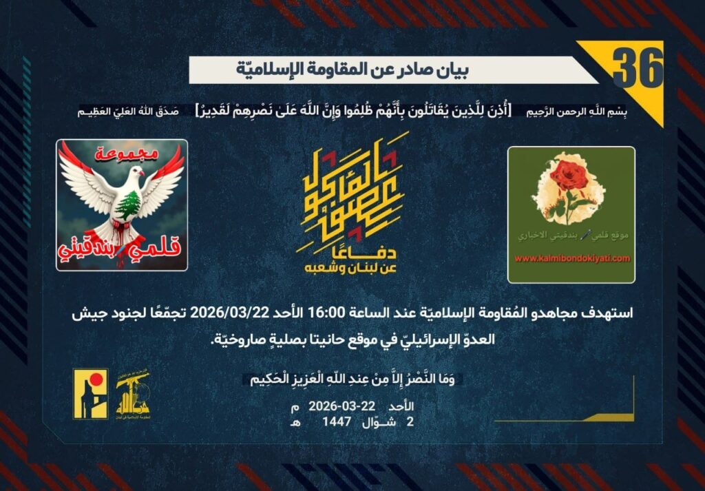 أصدرت المقاومة الاسلامية بعد البيان رقم “35” مباشرة بيان رقم “36” :”دفاعًا عن لبنان وشعبه، استهدف مجاهدو المُقاومة الإسلاميّة عند الساعة 16:00 الأحد 22/03/2026 تجمّعًا لجنود جيش العدوّ الإسرائيليّ في موقع حانيتا بصليةٍ صاروخيّة.