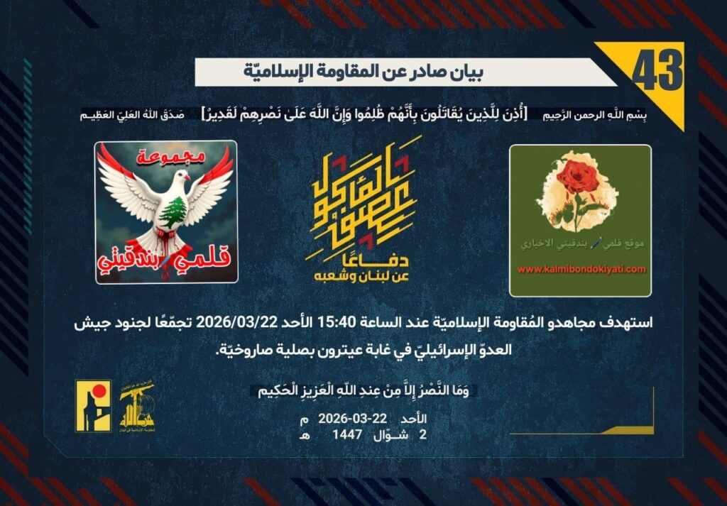 أصدرت المقاومة الاسلامية بعد البيان رقم (41 و 42) مباشرة بيان رقم”43″ :”دفاعًا عن لبنان وشعبه، استهدف مجاهدو المُقاومة الإسلاميّة عند الساعة 15:40 الأحد 22/03/2026 تجمّعًا لجنود جيش العدوّ الإسرائيليّ في غابة عيترون بصلية صاروخيّة.