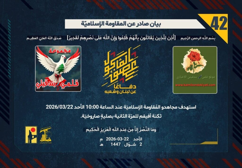 أصدرت المقاومة الاسلامية بعد البيان رقم “41” مباشرة بيان رقم “42” :”دفاعًا عن لبنان وشعبه، استهدف مجاهدو المُقاومة الإسلاميّة عند الساعة 10:00 الأحد 22/03/2026 ثكنة أفيفيم للمرّة الثانية بصليةٍ صاروخيّة.