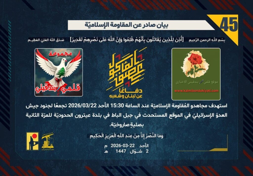 أصدرت المقاومة الاسلامية بعد البيان رقم “44” مباشرةبيان رقم “45” :”دفاعًا عن لبنان وشعبه، استهدف مجاهدو المُقاومة الإسلاميّة عند الساعة 15:30 الأحد 22/03/2026 تجمعًا لجنود جيش العدوّ الإسرائيليّ في الموقع المستحدث في جبل الباط في بلدة عيترون الحدوديّة للمرّة الثانية بصليةٍِ صاروخيّة.