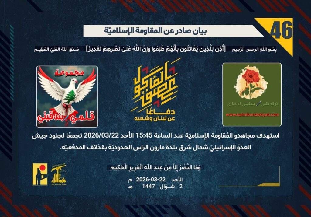 أصدرت المقاومة الاسلامية بعد البيان رقم (44 و 45) مباشرة بيان رقم (46) :”دفاعًا عن لبنان وشعبه، استهدف مجاهدو المُقاومة الإسلاميّة عند الساعة 15:45 الأحد 22/03/2026 تجمعًا لجنود جيش العدوّ الإسرائيليّ شمال شرق بلدة مارون الراس الحدوديّة بقذائف المدفعيّة.