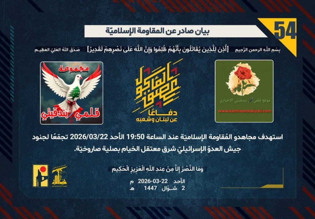 أصدرت المقاومة الاسلامية بعد البيان رقم ’53’ مباشرة بيان رقم’54’ :”دفاعًا عن لبنان وشعبه، استهدف مجاهدو المُقاومة الإسلاميّة عند الساعة 19:50 الأحد 22/03/2026 تجمّعًا لجنود جيش العدوّ الإسرائيليّ شرق معتقل الخيام بصلية صاروخيّة.