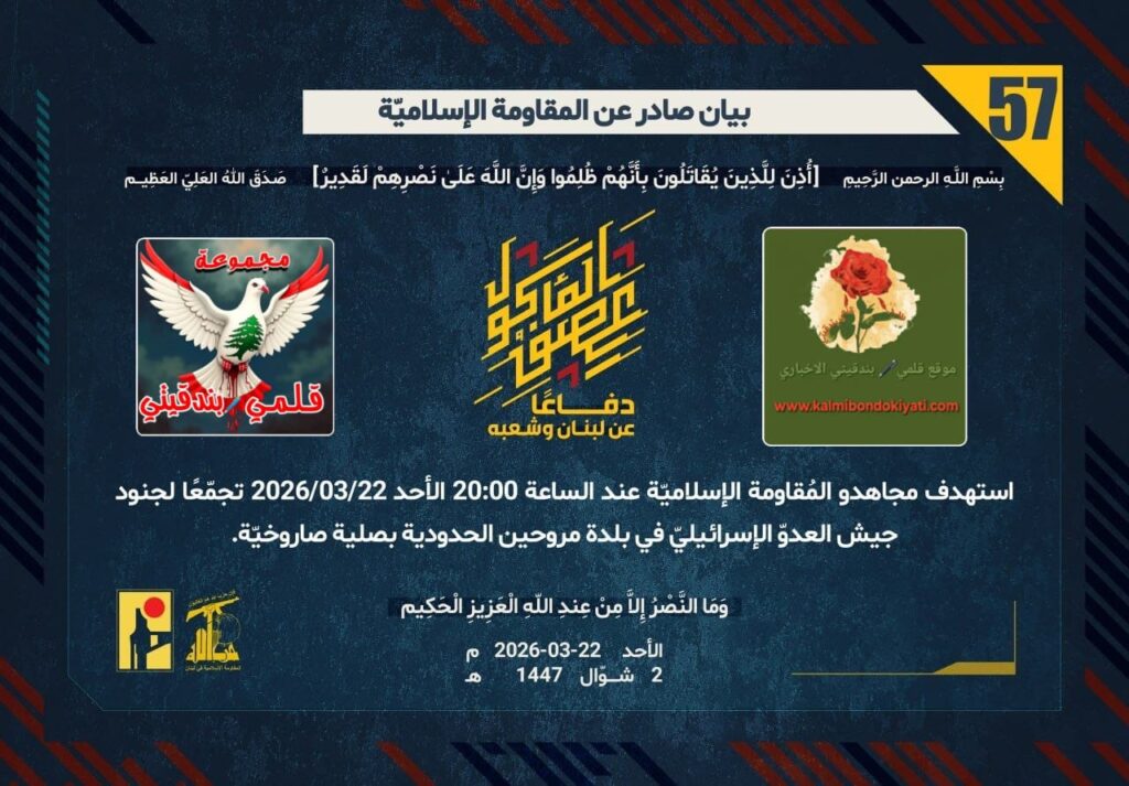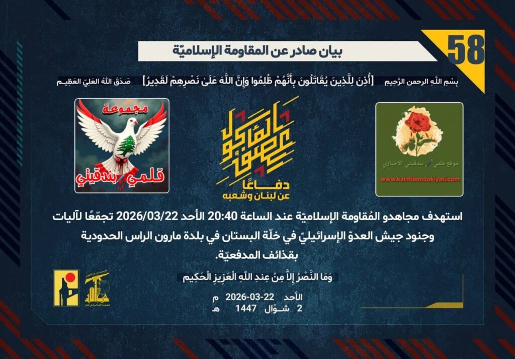 أصدرت المقاومة الاسلامية بعد البيان رقم (56 و 57) مباشرة بيان رقم “58” :”دفاعًا عن لبنان وشعبه، استهدف مجاهدو المُقاومة الإسلاميّة عند الساعة 20:40 الأحد 22/03/2026 تجمّعًا لآليات وجنود جيش العدوّ الإسرائيليّ في خلّة البستان في بلدة مارون الراس الحدودية بقذائف المدفعيّة.