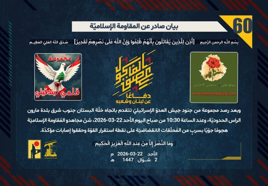 أصدرت المقاومة الاسلامية بعد البيان رقم “59” مباشرة بيان رقم “60” :”دفاعًا عن لبنان وشعبه، وبعد رصد مجموعة من جنود جيش العدوّ الإسرائيليّ تتقدم باتجاه خلّة البستان جنوب شرق بلدة مارون الراس الحدوديّة، وعند الساعة 10:30 من صباح اليوم الأحد 22-03-2026، شنّ مجاهدو المُقاومة الإسلاميّة هجومًا جوّيًا بسربٍ من المُحلّقات الانقضاضيّة على نقطة استقرار القوّة وحققوا إصابات مؤكدّة.