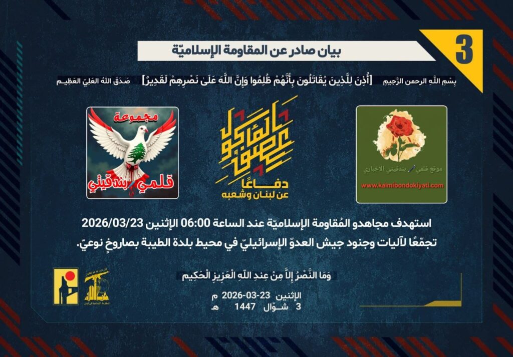أصدرت المقاومة الاسلامية بعد البيان رقم (1 و 2) مباشرة بيان رقم’3′ :”دفاعًا عن لبنان وشعبه، استهدف مجاهدو المُقاومة الإسلاميّة عند الساعة 06:00 الإثنين 23/03/2026تجمّعًا لآليات وجنود جيش العدوّ الإسرائيليّ في محيط بلدة الطيبة بصاروخٍ نوعيّ.