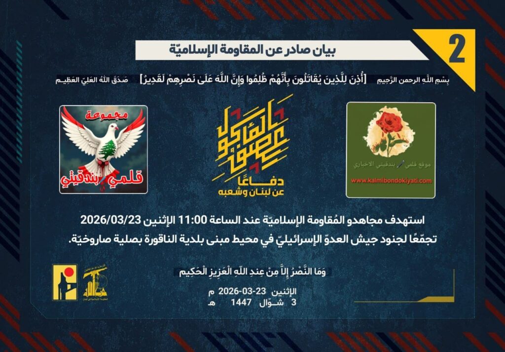 أصدرت المقاومة الاسلامية بعد البيان رقم ‘1’ مباشرة بيان رقم’2′ :”دفاعًا عن لبنان وشعبه، استهدف مجاهدو المُقاومة الإسلاميّة عند الساعة 11:00 الإثنين 23/03/2026تجمّعًا لجنود جيش العدوّ الإسرائيليّ في محيط مبنى بلدية الناقورة بصلية صاروخيّة.