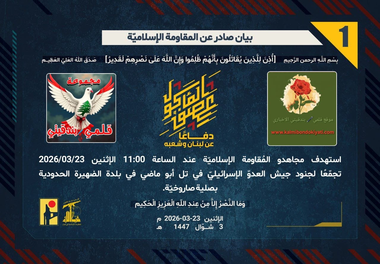 صدر بيان رقم’1′ للمقاومة الاسلامية الآتي نصه:”دفاعًا عن لبنان وشعبه، استهدف مجاهدو المُقاومة الإسلاميّة عند الساعة 11:00 الإثنين 23/03/2026تجمّعًا لجنود جيش العدوّ الإسرائيليّ في تل أبو ماضي في بلدة الضهيرة الحدودية بصلية صاروخيّة.