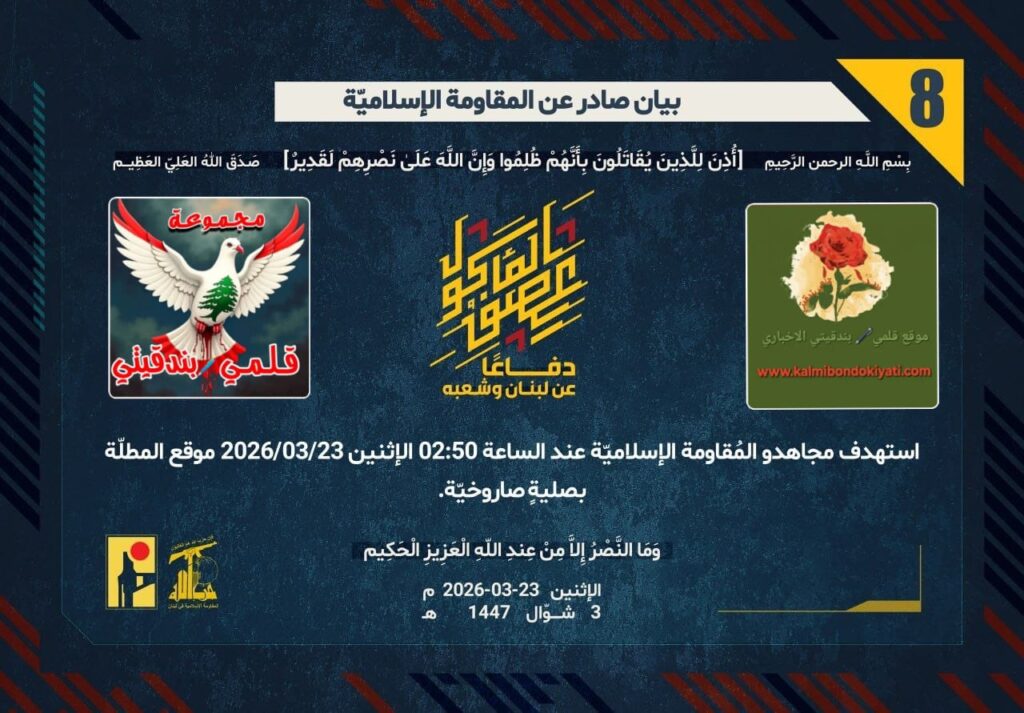 أصدرت المقاومة الاسلامية بعد البيان رقم “7” مباشرة بيان رقم “8” :”دفاعًا عن لبنان وشعبه، استهدف مجاهدو المُقاومة الإسلاميّة عند الساعة 02:50 الإثنين 23/03/2026 موقع المطلّة بصليةٍ صاروخيّة.