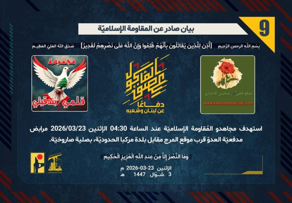 أصدرت المقاومة الاسلامية بعد البيان رقم (7 و 8) مباشرة بيان رقم “9” :”دفاعًا عن لبنان وشعبه، استهدف مجاهدو المُقاومة الإسلاميّة عند الساعة 04:30 الإثنين 23/03/2026 مرابض مدفعيّة العدوّ قرب موقع المرج مقابل بلدة مركبا الحدوديّة، بصلية صاروخيّة.
