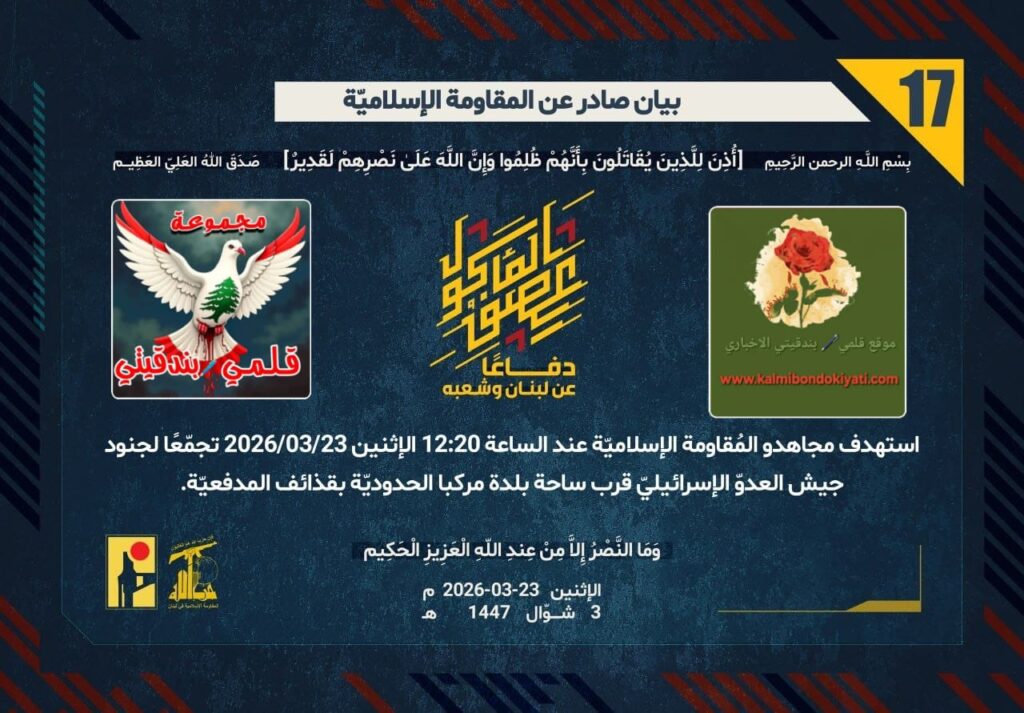 أصدرت المقاومة الاسلامية بعد البيان رقم “16” مباشرة بيان رقم “17” :”دفاعًا عن لبنان وشعبه، استهدف مجاهدو المُقاومة الإسلاميّة عند الساعة 12:20 الإثنين 23/03/2026 تجمّعًا لجنود جيش العدوّ الإسرائيليّ قرب ساحة بلدة مركبا الحدوديّة بقذائف المدفعيّة.