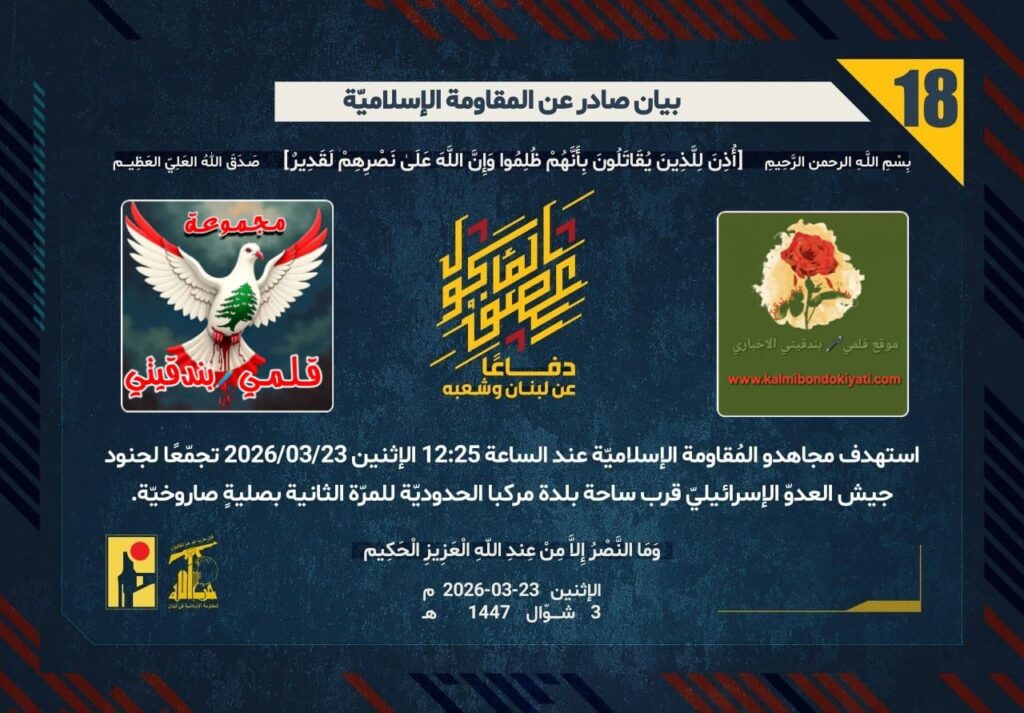 أصدرت المقاومة الاسلامية بعد البيان رقم (16 و 17) مباشرة بيان رقم”18″ :”دفاعًا عن لبنان وشعبه، استهدف مجاهدو المُقاومة الإسلاميّة عند الساعة 12:25 الإثنين 23/03/2026 تجمّعًا لجنود جيش العدوّ الإسرائيليّ قرب ساحة بلدة مركبا الحدوديّة للمرّة الثانية بصليةٍ صاروخيّة.