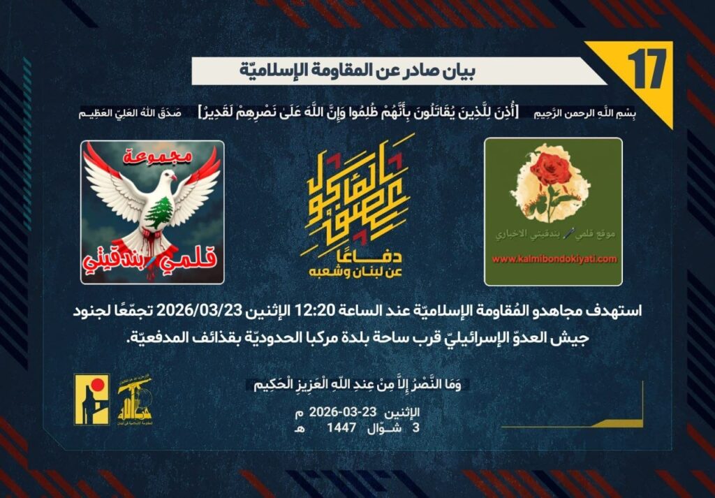 أصدرت المقاومة الاسلامية بعد البيان رقم ’16’ مباشرة بيان رقم’17’ :”دفاعًا عن لبنان وشعبه، استهدف مجاهدو المُقاومة الإسلاميّة عند الساعة 12:20 الإثنين 23/03/2026 تجمّعًا لجنود جيش العدوّ الإسرائيليّ قرب ساحة بلدة مركبا الحدوديّة بقذائف المدفعيّة.