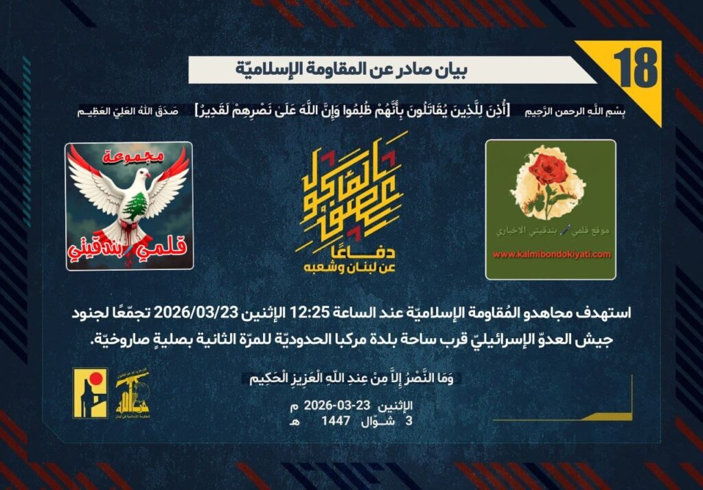 أصدرت المقاومة الاسلامية بعد البيان رقم (16 و 17) مباشرة بيان رقم’18’ :”دفاعًا عن لبنان وشعبه، استهدف مجاهدو المُقاومة الإسلاميّة عند الساعة 12:25 الإثنين 23/03/2026 تجمّعًا لجنود جيش العدوّ الإسرائيليّ قرب ساحة بلدة مركبا الحدوديّة للمرّة الثانية بصليةٍ صاروخيّة.