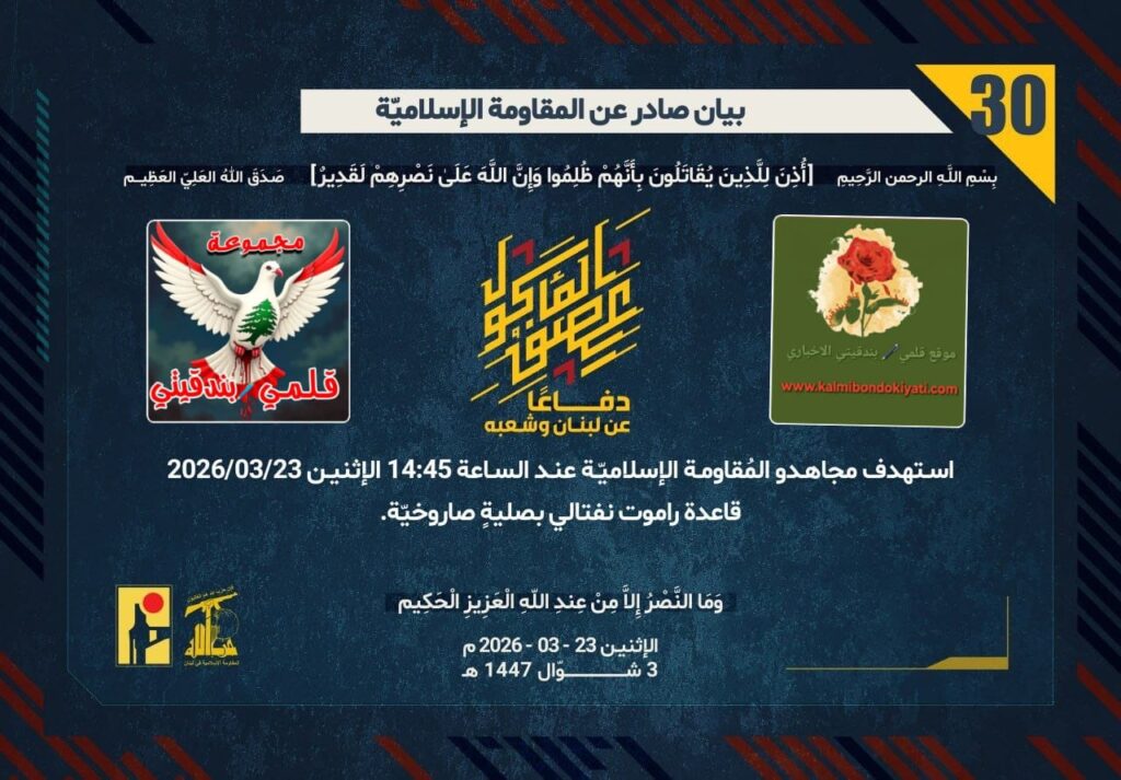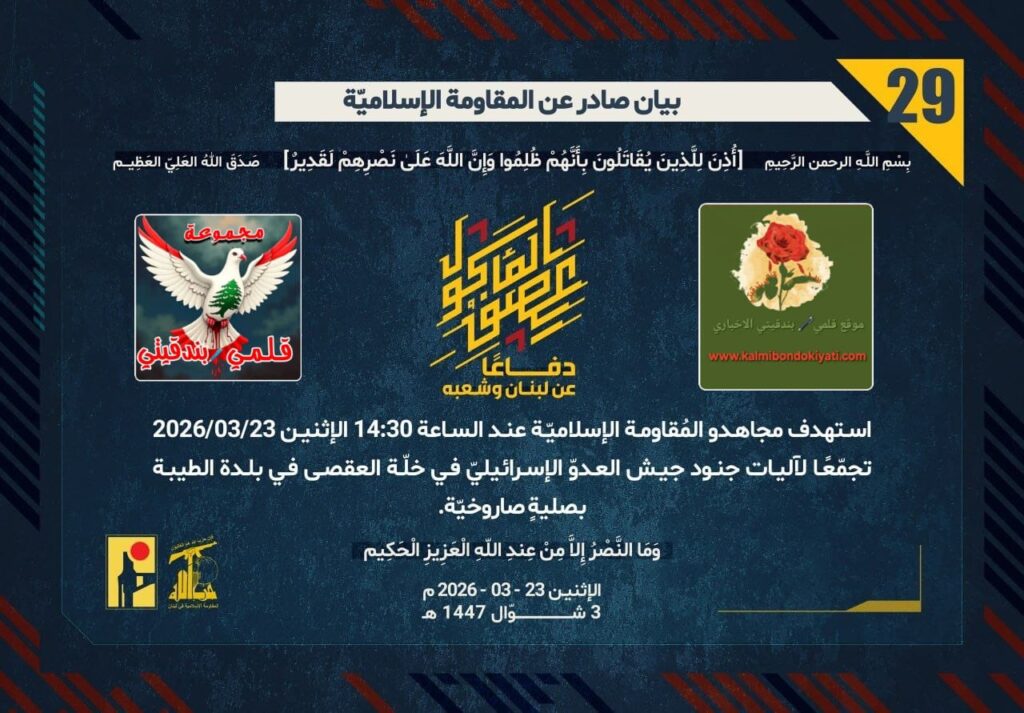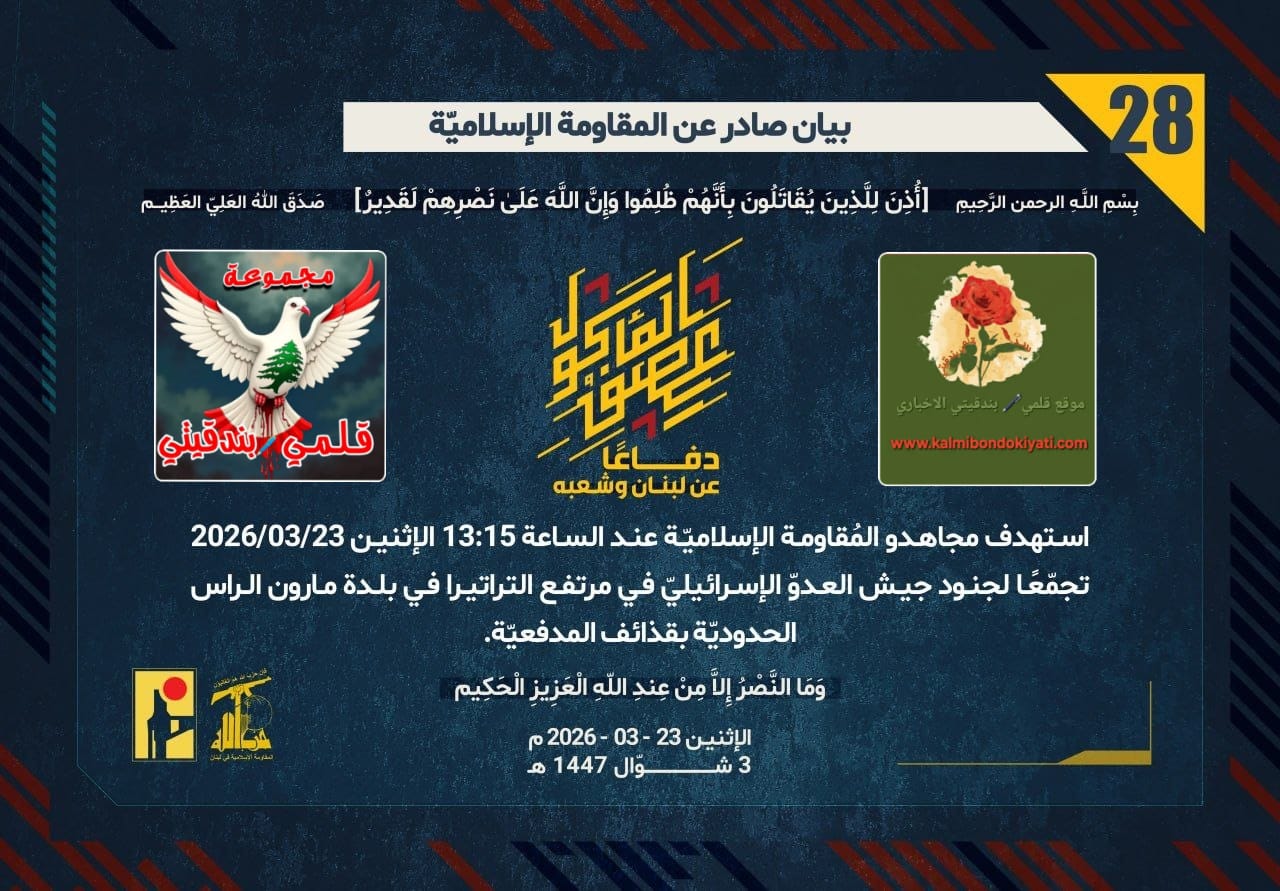 ุตุฏุฑ ุจูุงู ุฑูู ’28’ ููู ูุงูู ุฉ ุงูุงุณูุงู ูุฉ ุงูุขุชู ูุตู:”ุฏูุงุนูุง ุนู ูุจูุงู ูุดุนุจูุ ุงุณุชูุฏู ู ุฌุงูุฏู ุงูู ููุงูู ุฉ ุงูุฅุณูุงู ููุฉ ุนูุฏ ุงูุณุงุนุฉ 13:15 ุงูุฅุซููู 23/03/2026 ุชุฌู ูุนูุง ูุฌููุฏ ุฌูุด ุงูุนุฏูู ุงูุฅุณุฑุงุฆูููู ูู ู ุฑุชูุน ุงูุชุฑุงุชูุฑุง ูู ุจูุฏุฉ ู ุงุฑูู ุงูุฑุงุณ ุงูุญุฏูุฏููุฉ ุจูุฐุงุฆู ุงูู ุฏูุนููุฉ.