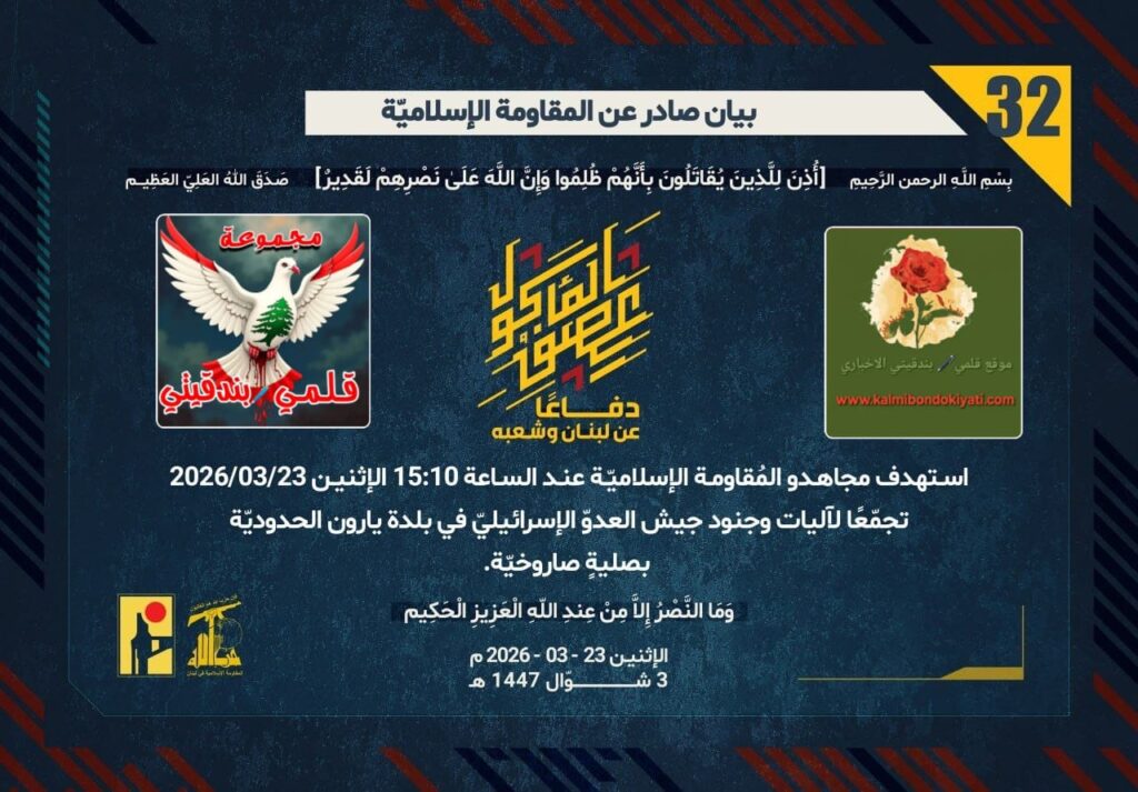 ุฃุตุฏุฑุช ุงูู ูุงูู ุฉ ุงูุงุณูุงู ูุฉ ุจุนุฏ ุงูุจูุงู ุฑูู ’31’ ู ุจุงุดุฑุฉ ุจูุงู ุฑูู ’32’ :โุฏูุงุนูุง ุนู ูุจูุงู ูุดุนุจูุ ุงุณุชูุฏู ู ุฌุงูุฏู ุงูู ููุงูู ุฉ ุงูุฅุณูุงู ููุฉ ุนูุฏ ุงูุณุงุนุฉ 15:10 ุงูุฅุซููู 23/03/2026 ุชุฌู ูุนูุง ูุขููุงุช ูุฌููุฏ ุฌูุด ุงูุนุฏูู ุงูุฅุณุฑุงุฆูููู ูู ุจูุฏุฉ ูุงุฑูู ุงูุญุฏูุฏููุฉ ุจุตููุฉู ุตุงุฑูุฎููุฉ.