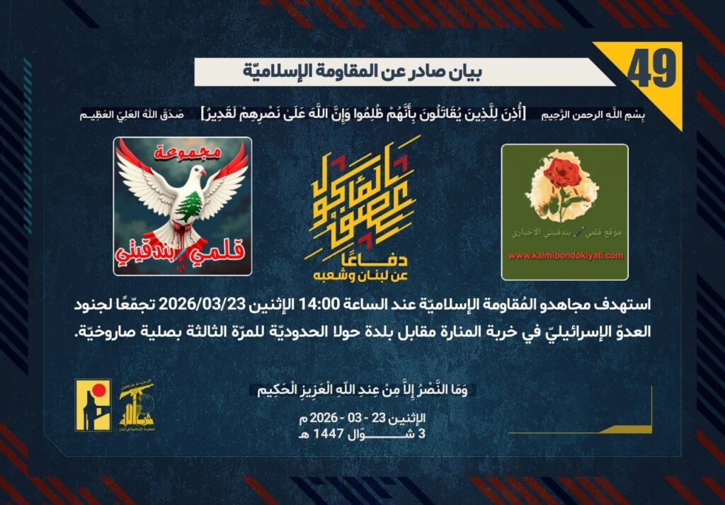 أصدرت المقاومة الاسلامية بعد البيان رقم “48” مباشرة بيان رقم “49” :”دفاعًا عن لبنان وشعبه، استهدف مجاهدو المُقاومة الإسلاميّة عند الساعة 14:00 الإثنين 23/03/2026 تجمّعًا لجنود العدوّ الإسرائيليّ في خربة المنارة مقابل بلدة حولا الحدوديّة للمرّة الثالثة بصلية صاروخيّة.