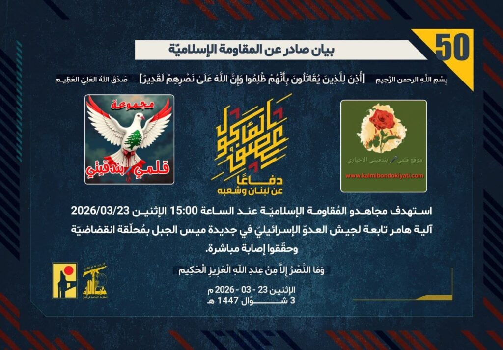 أصدرت المقاومة الاسلامية بعد البيان رقم (48 و 49) مباشرة بيان رقم “50” :”دفاعًا عن لبنان وشعبه، استهدف مجاهدو المُقاومة الإسلاميّة عند الساعة 15:00 الإثنين 23/03/2026 آلية هامر تابعة لجيش العدوّ الإسرائيليّ في جديدة ميس الجبل بمُحلّقة انقضاضيّة وحقّقوا إصابة مباشرة.