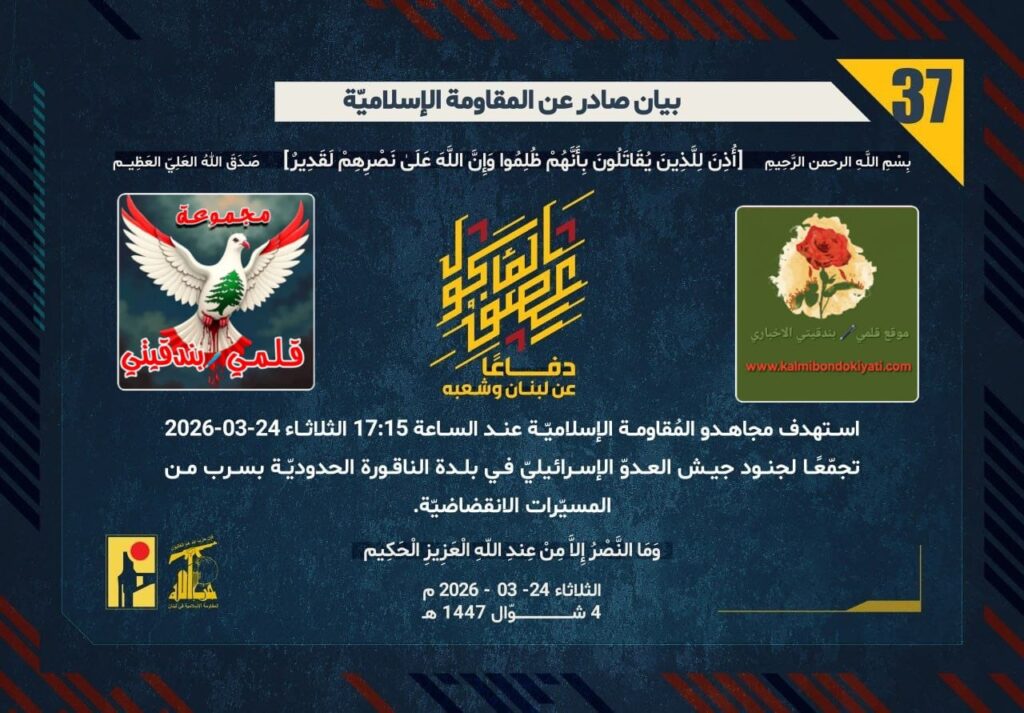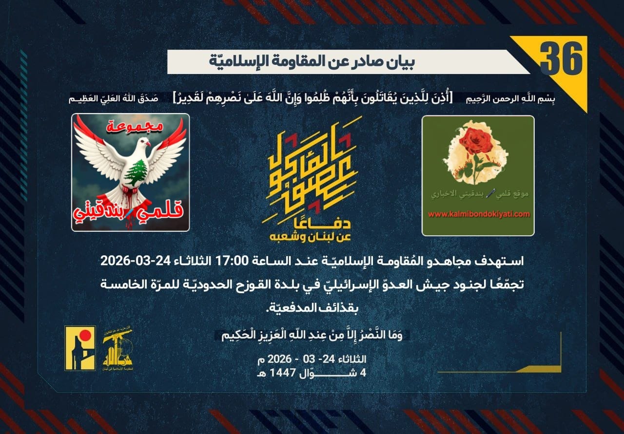 ุตุฏุฑ ุจูุงู ุฑูู “36” ููู ูุงูู ุฉ ุงูุงุณูุงู ูุฉ ุงูุขุชู ูุตู:”ุฏูุงุนูุง ุนู ูุจูุงู ูุดุนุจูุ ุงุณุชูุฏู ู ุฌุงูุฏู ุงูู ููุงูู ุฉ ุงูุฅุณูุงู ููุฉ ุนูุฏ ุงูุณุงุนุฉ 17:00 ุงูุซูุงุซุงุก 24-03-2026 ุชุฌู ูุนูุง ูุฌููุฏ ุฌูุด ุงูุนุฏูู ุงูุฅุณุฑุงุฆูููู ูู ุจูุฏุฉ ุงูููุฒุญ ุงูุญุฏูุฏููุฉ ููู ุฑูุฉ ุงูุฎุงู ุณุฉ ุจูุฐุงุฆู ุงูู ุฏูุนููุฉ.