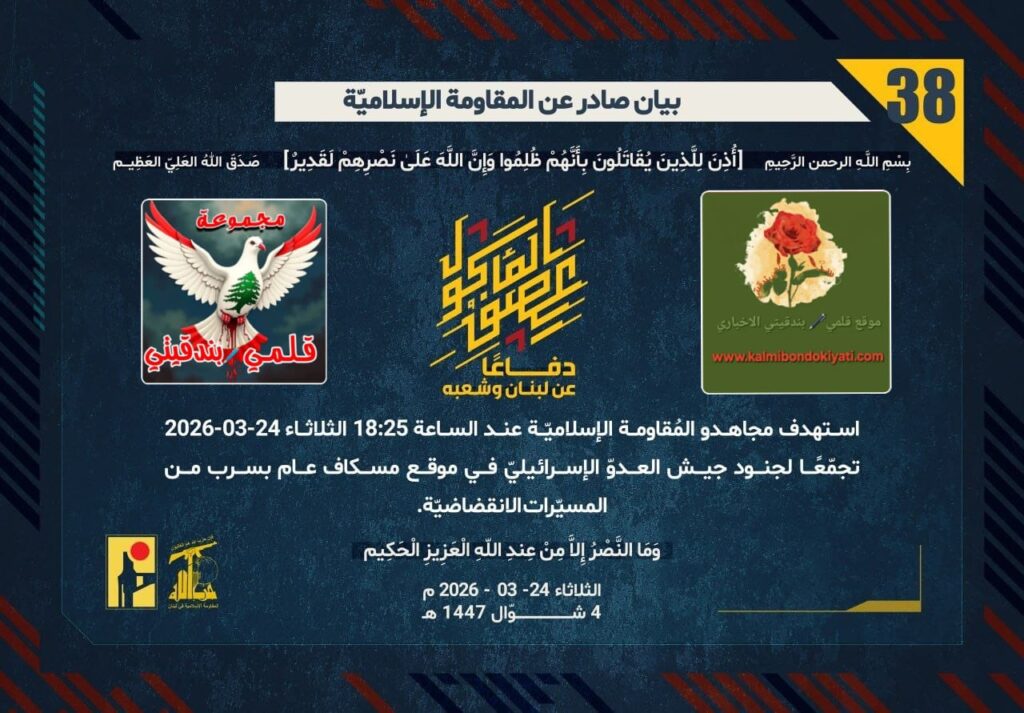 ุฃุตุฏุฑุช ุงูู ูุงูู ุฉ ุงูุงุณูุงู ูุฉ ุจุนุฏ ุงูุจูุงู ุฑูู (36 ู 37) ู ุจุงุดุฑุฉ ุจูุงู ุฑูู “38” :โุฏูุงุนูุง ุนู ูุจูุงู ูุดุนุจูุ ุงุณุชูุฏู ู ุฌุงูุฏู ุงูู ููุงูู ุฉ ุงูุฅุณูุงู ููุฉ ุนูุฏ ุงูุณุงุนุฉ 18:25 ุงูุซูุงุซุงุก 24-03-2026 ุชุฌู ูุนูุง ูุฌููุฏ ุฌูุด ุงูุนุฏูู ุงูุฅุณุฑุงุฆูููู ูู ู ููุน ู ุณูุงู ุนุงู ุจุณุฑุจ ู ู ุงูู ุณููุฑุงุช ุงูุงููุถุงุถููุฉ.
