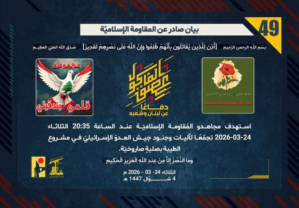 ุตุฏุฑ ุจูุงู ุฑูู “48” ููู ูุงูู ุฉ ุงูุงุณูุงู ูุฉ ุงูุขุชู ูุตู:”ุฏูุงุนูุง ุนู ูุจูุงู ูุดุนุจูุ ุงุณุชูุฏู ู ุฌุงูุฏู ุงูู ููุงูู ุฉ ุงูุฅุณูุงู ููุฉ ุนูุฏ ุงูุณุงุนุฉ 17:10 ุงูุซูุงุซุงุก 24-03-2026 ู ุฑุจุถ ู ุฏูุนููุฉ ุงูุนุฏูู ูู ู ุณุชูุทูุฉ ุฏูุดูู ุจุตููุฉู ุตุงุฑูุฎููุฉ.