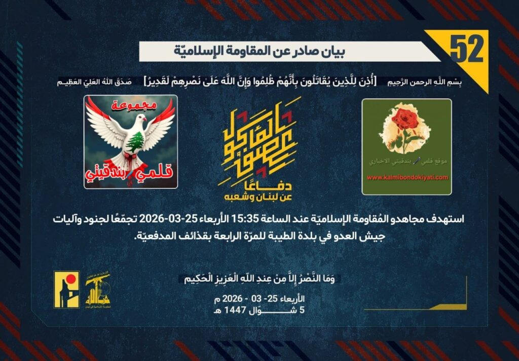 أصدرت المقاومة الاسلامية بعد البيان رقم (50 و 51) مباشرة بيان رقم’52’ :”دفاعًا عن لبنان وشعبه، استهدف مجاهدو المُقاومة الإسلاميّة عند الساعة 15:35 الأربعاء 25-03-2026 تجمّعًا لجنود وآليات جيش العدو في بلدة الطيبة للمرّة الرابعة بقذائف المدفعيّة.