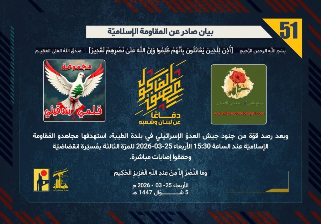 أصدرت المقاومة الاسلامية بعد البيان رقم ’50’ مباشرة بيان رقم’51’ :”دفاعًا عن لبنان وشعبه، وبعد رصد قوّة من جنود جيش العدوّ الإسرائيلي في بلدة الطيبة، استهدفها مجاهدو المُقاومة الإسلاميّة عند الساعة 15:30 الأربعاء 25-03-2026 للمرّة الثالثة بمُسيّرة انقضاضيّة وحققوا إصابات مباشرة.
