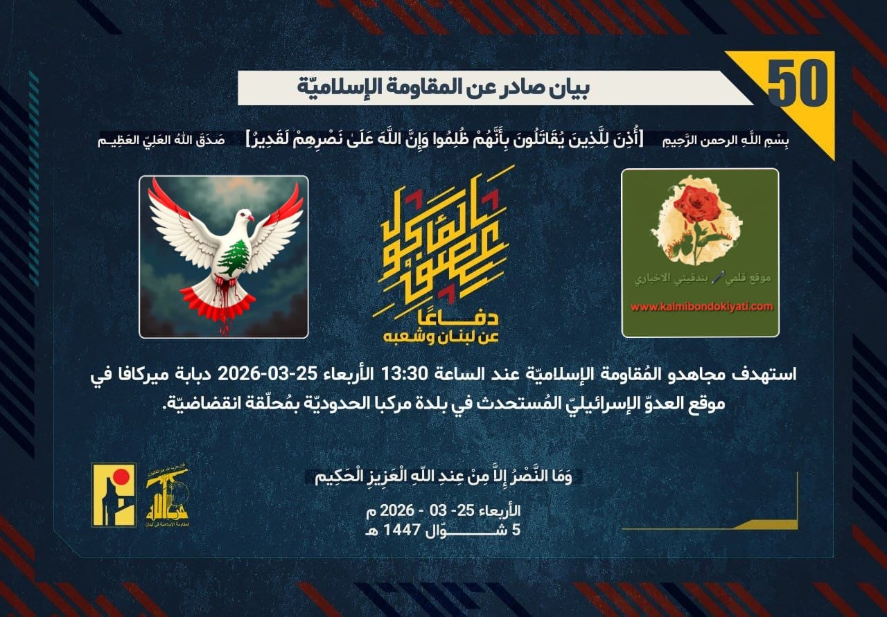 صدر بيان رقم’50’ للمقاومة الاسلامية الآتي نصه:”دفاعًا عن لبنان وشعبه، استهدف مجاهدو المُقاومة الإسلاميّة عند الساعة 13:30 الأربعاء 25-03-2026 دبابة ميركافا في موقع العدوّ الإسرائيليّ المُستحدث في بلدة مركبا الحدوديّة بمُحلّقة انقضاضيّة.