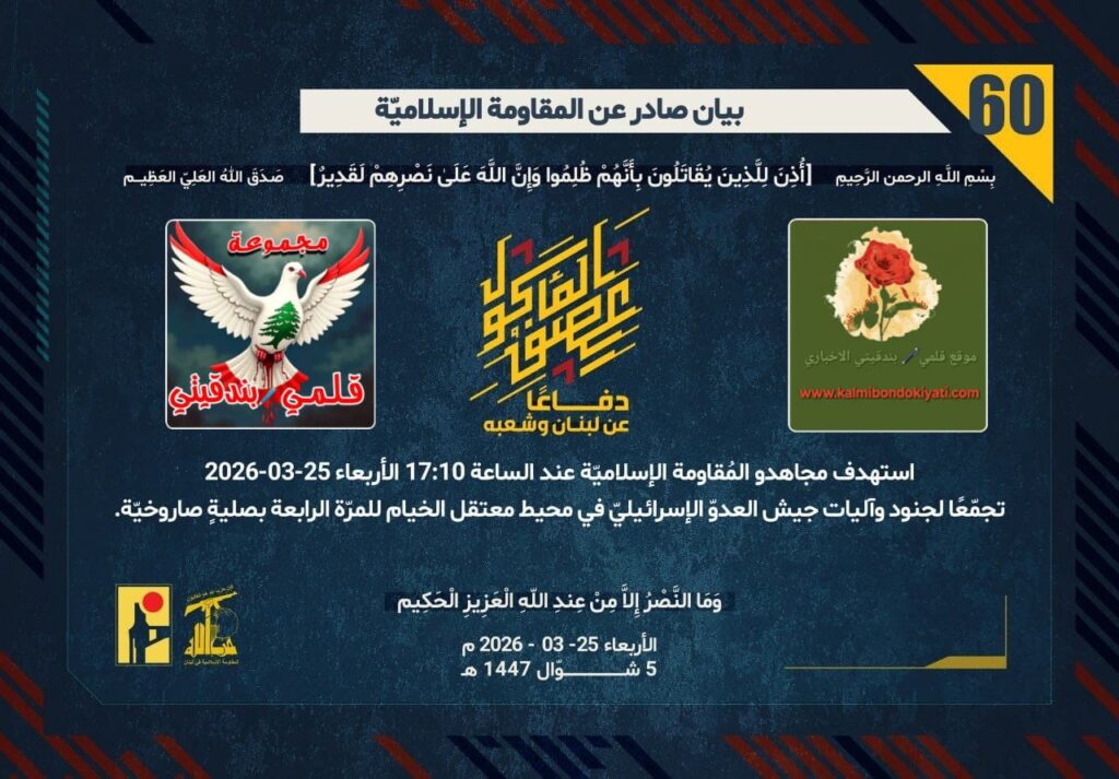أصدرت المقاومة الاسلامية بعد البيان رقم ’59’ مباشرة بيان رقم: 60′ :”دفاعًا عن لبنان وشعبه، استهدف مجاهدو المُقاومة الإسلاميّة عند الساعة 17:10 الأربعاء 25-03-2026 تجمّعًا لجنود وآليات جيش العدوّ الإسرائيليّ في محيط معتقل الخيام للمرّة الرابعة بصليةٍ صاروخيّة.