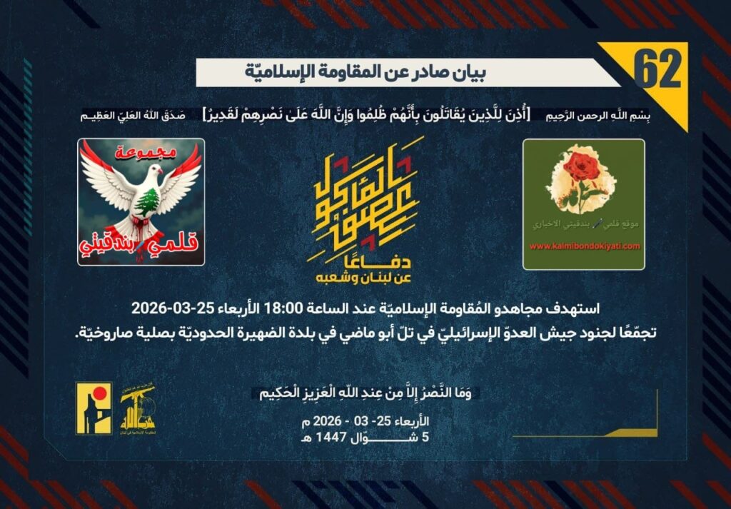 أصدرت المقاومة الاسلامية بعد البيان رقم” 61″ مباشرة بيان رقم “62” :”دفاعًا عن لبنان وشعبه، استهدف مجاهدو المُقاومة الإسلاميّة عند الساعة 18:00 الأربعاء 25-03-2026 تجمّعًا لجنود جيش العدوّ الإسرائيليّ في تلّ أبو ماضي في بلدة الضهيرة الحدوديّة بصليةٍ صاروخيّة.