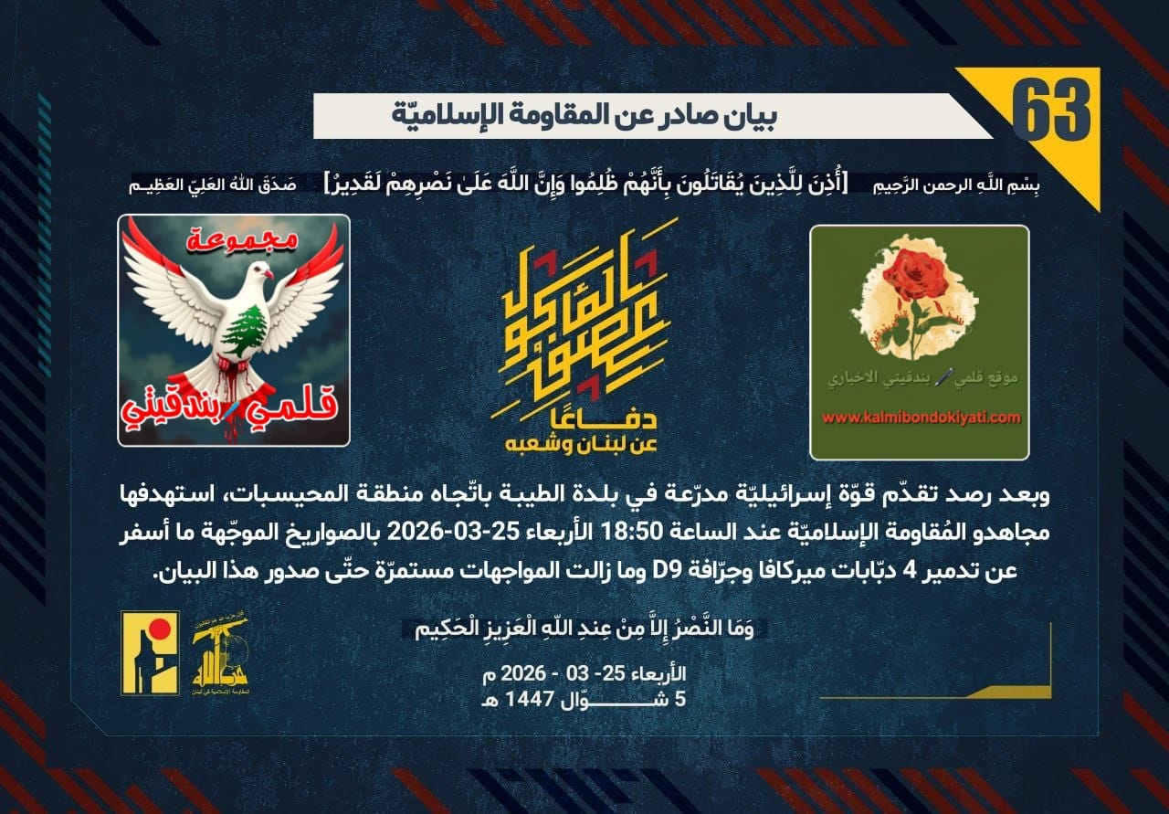 صدر بيان رقم “63” للمقاومة الاسلامية الآتي نصه:”دفاعًا عن لبنان وشعبه، وبعد رصد تقدّم قوّة إسرائيليّة مدرّعة في بلدة الطيبة باتّجاه منطقة المحيسبات، استهدفها مجاهدو المُقاومة الإسلاميّة عند الساعة 18:50 الأربعاء 25-03-2026 بالصواريخ الموجّهة ما أسفر عن تدمير 4 دبّابات ميركافا وجرّافة D9 وما زالت المواجهات مستمرّة حتّى صدور هذا البيان.