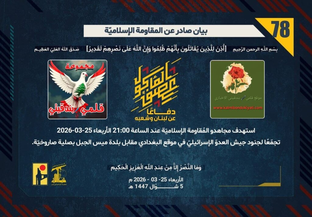 ุฃุตุฏุฑุช ุงูู ูุงูู ุฉ ุงูุงุณูุงู ูุฉ ุจุนุฏ ุงูุจูุงู ุฑูู “77” ู ุจุงุดุฑุฉ ุจูุงู ุฑูู “78” :โุฏูุงุนูุง ุนู ูุจูุงู ูุดุนุจูุ ุงุณุชูุฏู ู ุฌุงูุฏู ุงูู ููุงูู ุฉ ุงูุฅุณูุงู ููุฉ ุนูุฏ ุงูุณุงุนุฉ 21:00 ุงูุฃุฑุจุนุงุก 25-03-2026 ุชุฌู ูุนูุง ูุฌููุฏ ุฌูุด ุงูุนุฏูู ุงูุฅุณุฑุงุฆูููู ูู ู ููุน ุงูุจุบุฏุงุฏู ู ูุงุจู ุจูุฏุฉ ู ูุณ ุงูุฌุจู ุจุตููุฉ ุตุงุฑูุฎููุฉ.