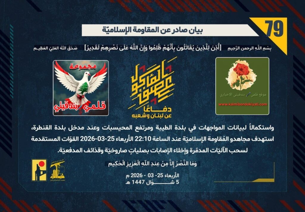 ุตุฏุฑ ุจูุงู ุฑูู “77” ููู ูุงูู ุฉ ุงูุงุณูุงู ูุฉ ุงูุขุชู ูุตู:”ุฏูุงุนูุง ุนู ูุจูุงู ูุดุนุจูุ ููู ุฅุทุงุฑ โุงูุชุญุฐูุฑ ุงูุฐู ูุฌููุชู ุงูู ููุงูู ุฉ ุงูุฅุณูุงู ููุฉ ูุนุฏุฏู ู ู ู ุณุชูุทูุงุช ุดู ุงู ููุณุทูู ุงูู ุญุชูุฉุ ุงุณุชูุฏู ู ุฌุงูุฏู ุงูู ููุงูู ุฉ ุงูุฅุณูุงู ููุฉ ุนูุฏ ุงูุณุงุนุฉ 21:40 ุงูุฃุฑุจุนุงุก 25-03-2026 ู ุณุชูุทูุฉ ุงูู ุทููุฉ ููู ุฑูุฉ ุงูุซุงููุฉ ุจุตููุฉ ุตุงุฑูุฎููุฉ.