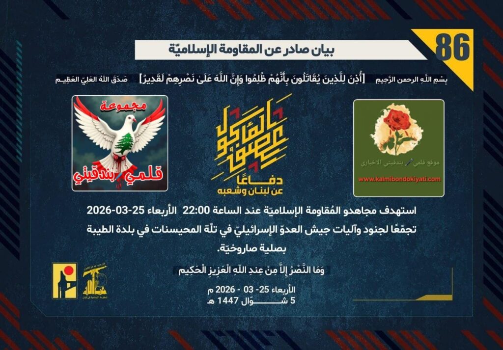 أصدرت المقاومة الاسلامية بعد البيان رقم ( 84 و 85) مباشرة بيان رقم “86” :”دفاعًا عن لبنان وشعبه، استهدف مجاهدو المُقاومة الإسلاميّة عند الساعة 22:00 الأربعاء 25-03-2026 تجمّعًا لجنود وآليات جيش العدوّ الإسرائيليّ في تلّة المحيسنات في بلدة الطيبة بصلية صاروخيّة.