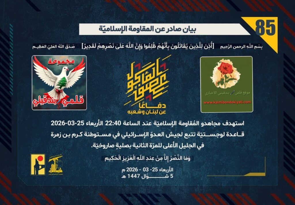 أصدرت المقاومة الاسلامية بعد البيان رقم “84” مباشرة بيان رقم “85” :”دفاعًا عن لبنان وشعبه، استهدف مجاهدو المُقاومة الإسلاميّة عند الساعة 22:40 الأربعاء 25-03-2026 قاعدة لوجستيّة تتبع لجيش العدوّ الإسرائيلي في مستوطنة كرم بن زمرة في الجليل الأعلى للمرّة الثانية بصليةٍ صاروخيّة.