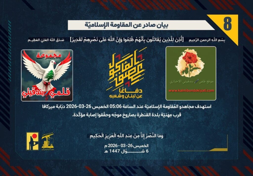 أصدرت المقاومة الاسلامية بعد البيان رقم “7” مباشرة بيان رقم “8” :”دفاعًا عن لبنان وشعبه، استهدف مجاهدو المُقاومة الإسلاميّة عند الساعة 05:06 الخميس 26-03-2026 دبّابة ميركافا قرب مِهَنيّة بلدة القنطرة بصاروخ موجّه وحقّقوا إصابة مؤكّدة.