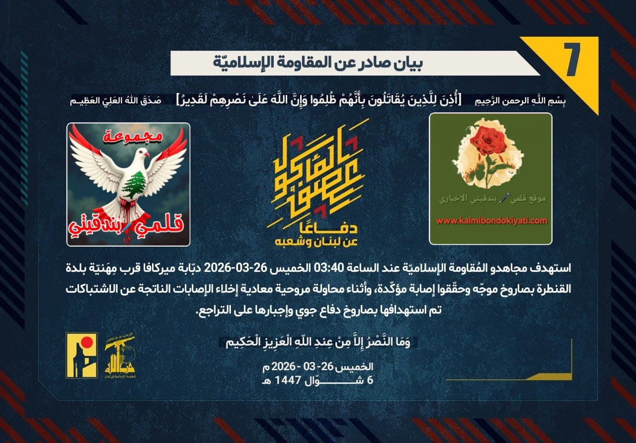 صدر بيان رقم “7” للمقاومة الاسلامية الآتي نصه:”دفاعًا عن لبنان وشعبه، استهدف مجاهدو المُقاومة الإسلاميّة عند الساعة 03:40 الخميس 26-03-2026 دبّابة ميركافا قرب مِهَنيّة بلدة القنطرة بصاروخ موجّه وحقّقوا إصابة مؤكّدة، وأثناء محاولة مروحية معادية إخلاء الإصابات الناتجة عن الاشتباكات، تم استهدافها بصاروخ دفاع جوي وإجبارها على التراجع.