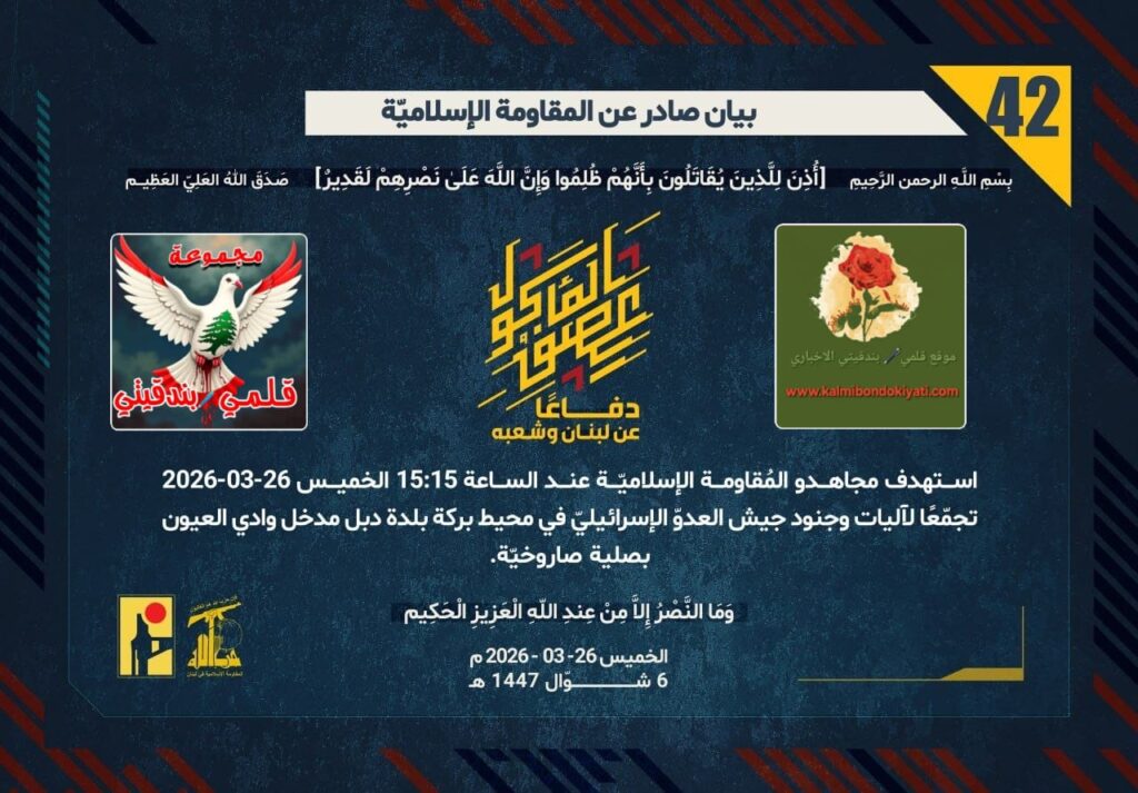 ุตุฏุฑ ุจูุงู ุฑูู “41” ููู ูุงูู ุฉ ุงูุงุณูุงู ูุฉ ุงูุขุชู ูุตู:”ุฏูุงุนูุง ุนู ูุจูุงู ูุดุนุจูุ ููู ุฅุทุงุฑ โุงูุชุญุฐูุฑ ุงูุฐู ูุฌููุชู ุงูู ููุงูู ุฉ ุงูุฅุณูุงู ููุฉ ูุนุฏุฏู ู ู ู ุณุชูุทูุงุช ุดู ุงู ููุณุทูู ุงูู ุญุชูุฉุ ุงุณุชูุฏู ู ุฌุงูุฏู ุงูู ููุงูู ุฉ ุงูุฅุณูุงู ููุฉ ุนูุฏ ุงูุณุงุนุฉ 14:00 ุงูุฎู ูุณ 26-03-2026 ู ุณุชูุทูุฉ ูุทูุนุง ุจุตููุฉู ุตุงุฑูุฎููุฉ.