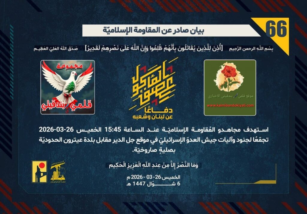 ุฃุตุฏุฑุช ุงู„ู…ู‚ุงูˆู…ุฉ ุงู„ุงุณู„ุงู…ูŠุฉ ุจุนุฏ ุงู„ุจูŠุงู† ุฑู‚ู… (64 ูˆ 65) ู…ุจุงุดุฑุฉ ุจูŠุงู† ุฑู‚ู… “66”:โ€ุฏูุงุนู‹ุง ุนู† ู„ุจู†ุงู† ูˆุดุนุจู‡ุŒ ุงุณุชู‡ุฏู ู…ุฌุงู‡ุฏูˆ ุงู„ู…ูู‚ุงูˆู…ุฉ ุงู„ุฅุณู„ุงู…ูŠู‘ุฉ ุนู†ุฏ ุงู„ุณุงุนุฉ 15:45 ุงู„ุฎู…ูŠุณ 26-03-2026 ุชุฌู…ู‘ุนู‹ุง ู„ุฌู†ูˆุฏ ูˆุขู„ูŠุงุช ุฌูŠุด ุงู„ุนุฏูˆู‘ ุงู„ุฅุณุฑุงุฆูŠู„ูŠู‘ ููŠ ู…ูˆู‚ุน ุฌู„ ุงู„ุฏูŠุฑ ู…ู‚ุงุจู„ ุจู„ุฏุฉ ุนูŠุชุฑูˆู† ุงู„ุญุฏูˆุฏูŠู‘ุฉ ุจุตู„ูŠุฉู ุตุงุฑูˆุฎูŠู‘ุฉ.