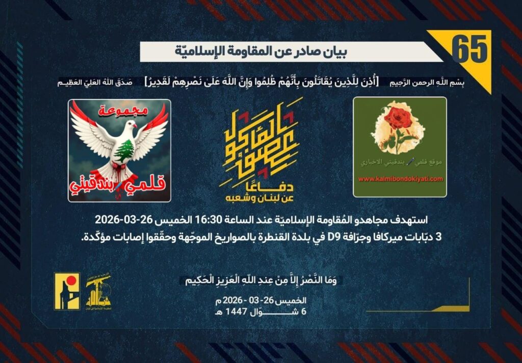ุฃุตุฏุฑุช ุงู„ู…ู‚ุงูˆู…ุฉ ุงู„ุงุณู„ุงู…ูŠุฉ ุจุนุฏ ุงู„ุจูŠุงู† ุฑู‚ู… “64” ู…ุจุงุดุฑุฉ ุจูŠุงู† ุฑู‚ู… “65” :โ€ุฏูุงุนู‹ุง ุนู† ู„ุจู†ุงู† ูˆุดุนุจู‡ุŒ ุงุณุชู‡ุฏู ู…ุฌุงู‡ุฏูˆ ุงู„ู…ูู‚ุงูˆู…ุฉ ุงู„ุฅุณู„ุงู…ูŠู‘ุฉ ุนู†ุฏ ุงู„ุณุงุนุฉ 16:30 ุงู„ุฎู…ูŠุณ 26-03-2026ุŒ 3 ุฏุจู‘ุงุจุงุช ู…ูŠุฑูƒุงูุง ูˆุฌุฑู‘ุงูุฉ D9 ููŠ ุจู„ุฏุฉ ุงู„ู‚ู†ุทุฑุฉ ุจุงู„ุตูˆุงุฑูŠุฎ ุงู„ู…ูˆุฌู‘ู‡ุฉ ูˆุญู‚ู‘ู‚ูˆุง ุฅุตุงุจุงุช ู…ุคูƒู‘ุฏุฉ.