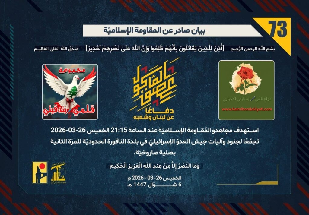 ุฃุตุฏุฑุช ุงู„ู…ู‚ุงูˆู…ุฉ ุงู„ุงุณู„ุงู…ูŠุฉ ุจุนุฏ ุงู„ุจูŠุงู† ุฑู‚ู… (70 ูˆ71 ูˆ 72)ุจุงุดุฑุฉ ุจูŠุงู† ุฑู‚ู… “73” :โ€ุฏูุงุนู‹ุง ุนู† ู„ุจู†ุงู† ูˆุดุนุจู‡ุŒ ุงุณุชู‡ุฏู ู…ุฌุงู‡ุฏูˆ ุงู„ู…ูู‚ุงูˆู…ุฉ ุงู„ุฅุณู„ุงู…ูŠู‘ุฉ ุนู†ุฏ ุงู„ุณุงุนุฉ 21:15 ุงู„ุฎู…ูŠุณ 26-03-2026 ุชุฌู…ู‘ุนู‹ุง ู„ุฌู†ูˆุฏ ูˆุขู„ูŠุงุช ุฌูŠุด ุงู„ุนุฏูˆู‘ ุงู„ุฅุณุฑุงุฆูŠู„ูŠู‘ ููŠ ุจู„ุฏุฉ ุงู„ู†ุงู‚ูˆุฑุฉ ุงู„ุญุฏูˆุฏูŠู‘ุฉ ู„ู„ู…ุฑู‘ุฉ ุงู„ุซุงู†ูŠุฉ ุจุตู„ูŠุฉ ุตุงุฑูˆุฎูŠู‘ุฉ.