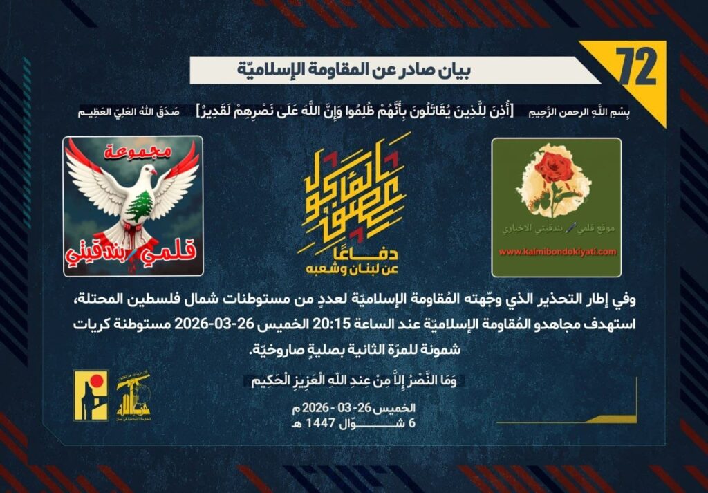 ุฃุตุฏุฑุช ุงู„ู…ู‚ุงูˆู…ุฉ ุงู„ุงุณู„ุงู…ูŠุฉ ุจุนุฏ ุงู„ุจูŠุงู† ุฑู‚ู… (70 ูˆ 71) ู…ุจุงุดุฑุฉ ุจูŠุงู† ุฑู‚ู… “72” :โ€ุฏูุงุนู‹ุง ุนู† ู„ุจู†ุงู† ูˆุดุนุจู‡ุŒ ูˆููŠ ุฅุทุงุฑ โ€ุงู„ุชุญุฐูŠุฑ ุงู„ุฐูŠ ูˆุฌู‘ู‡ุชู‡ ุงู„ู…ูู‚ุงูˆู…ุฉ ุงู„ุฅุณู„ุงู…ูŠู‘ุฉ ู„ุนุฏุฏู ู…ู† ู…ุณุชูˆุทู†ุงุช ุดู…ุงู„ ูู„ุณุทูŠู† ุงู„ู…ุญุชู„ุฉุŒ ุงุณุชู‡ุฏู ู…ุฌุงู‡ุฏูˆ ุงู„ู…ูู‚ุงูˆู…ุฉ ุงู„ุฅุณู„ุงู…ูŠู‘ุฉ ุนู†ุฏ ุงู„ุณุงุนุฉ 20:15 ุงู„ุฎู…ูŠุณ 26-03-2026 ู…ุณุชูˆุทู†ุฉ ูƒุฑูŠุงุช ุดู…ูˆู†ุฉ ู„ู„ู…ุฑู‘ุฉ ุงู„ุซุงู†ูŠุฉ ุจุตู„ูŠุฉู ุตุงุฑูˆุฎูŠู‘ุฉ.