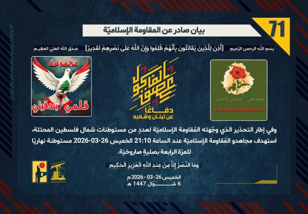 ุฃุตุฏุฑุช ุงู„ู…ู‚ุงูˆู…ุฉ ุงู„ุงุณู„ุงู…ูŠุฉ ุจุนุฏ ุงู„ุจูŠุงู† ุฑู‚ู… “70” ู…ุจุงุดุฑุฉ ุจูŠุงู† ุฑู‚ู… “71” :โ€ุฏูุงุนู‹ุง ุนู† ู„ุจู†ุงู† ูˆุดุนุจู‡ุŒ ูˆููŠ ุฅุทุงุฑ โ€ุงู„ุชุญุฐูŠุฑ ุงู„ุฐูŠ ูˆุฌู‘ู‡ุชู‡ ุงู„ู…ูู‚ุงูˆู…ุฉ ุงู„ุฅุณู„ุงู…ูŠู‘ุฉ ู„ุนุฏุฏู ู…ู† ู…ุณุชูˆุทู†ุงุช ุดู…ุงู„ ูู„ุณุทูŠู† ุงู„ู…ุญุชู„ุฉุŒ ุงุณุชู‡ุฏู ู…ุฌุงู‡ุฏูˆ ุงู„ู…ูู‚ุงูˆู…ุฉ ุงู„ุฅุณู„ุงู…ูŠู‘ุฉ ุนู†ุฏ ุงู„ุณุงุนุฉ 21:10 ุงู„ุฎู…ูŠุณ 26-03-2026 ู…ุณุชูˆุทู†ุฉ ู†ู‡ุงุฑูŠู‘ุง ู„ู„ู…ุฑู‘ุฉ ุงู„ุฑุงุจุนุฉ ุจุตู„ูŠุฉู ุตุงุฑูˆุฎูŠู‘ุฉ.