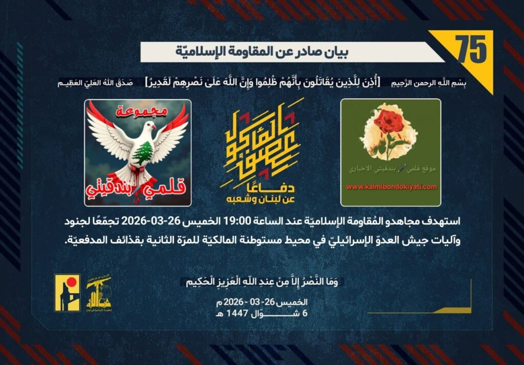 ุฏูุงุนู‹ุง ุนู† ู„ุจู†ุงู† ูˆุดุนุจู‡ุŒ ุงุณุชู‡ุฏู ู…ุฌุงู‡ุฏูˆ ุงู„ู…ูู‚ุงูˆู…ุฉ ุงู„ุฅุณู„ุงู…ูŠู‘ุฉ ุนู†ุฏ ุงู„ุณุงุนุฉ 19:00 ูŠูˆู… ุงู„ุฎู…ูŠุณ 26-03-2026 ุชุฌู…ู‘ุนู‹ุง ู„ุฌู†ูˆุฏ ูˆุขู„ูŠุงุช ุฌูŠุด ุงู„ุนุฏูˆู‘ ุงู„ุฅุณุฑุงุฆูŠู„ูŠู‘ ููŠ ู…ุญูŠุท ู…ุณุชูˆุทู†ุฉ ุงู„ู…ุงู„ูƒูŠู‘ุฉ ู„ู„ู…ุฑู‘ุฉ ุงู„ุซุงู†ูŠุฉ ุจู‚ุฐุงุฆู ุงู„ู…ุฏูุนูŠู‘ุฉ.