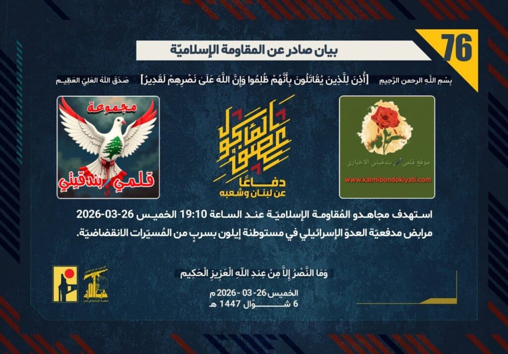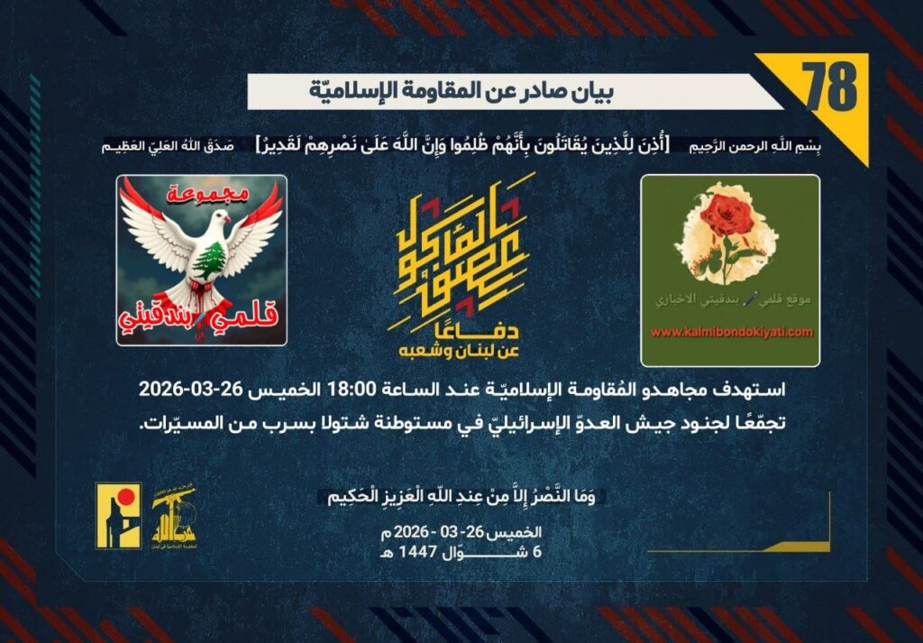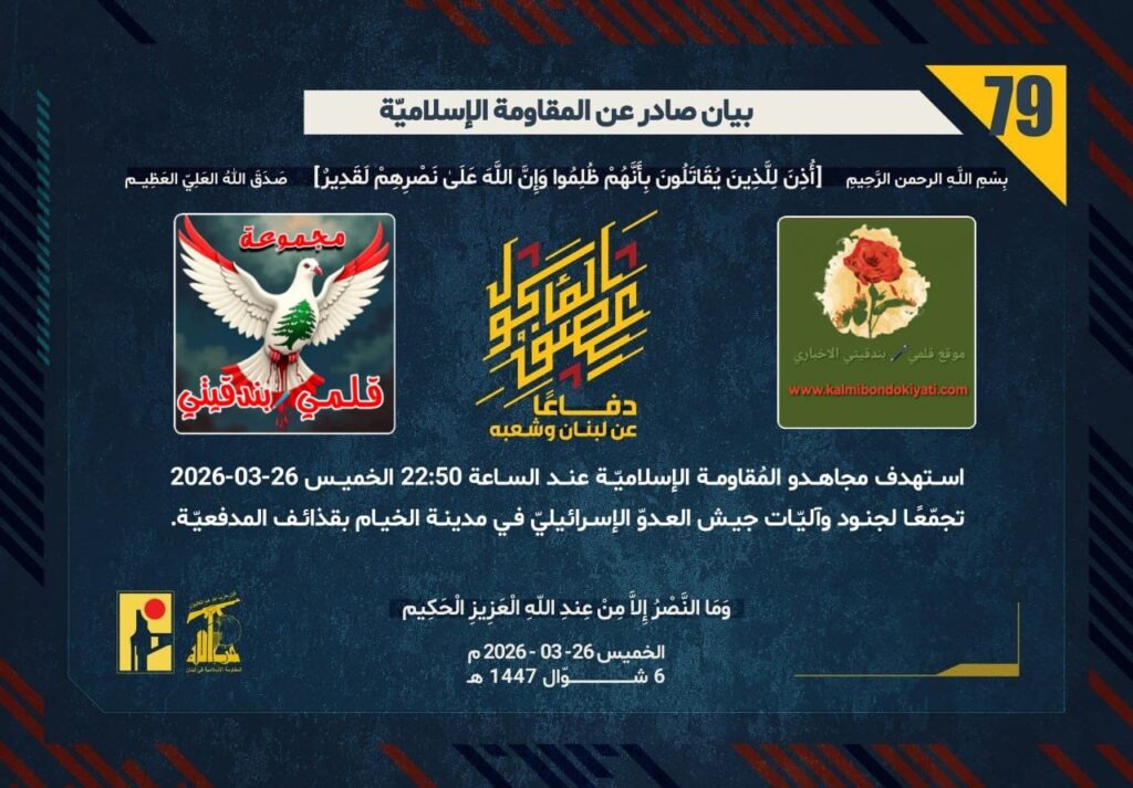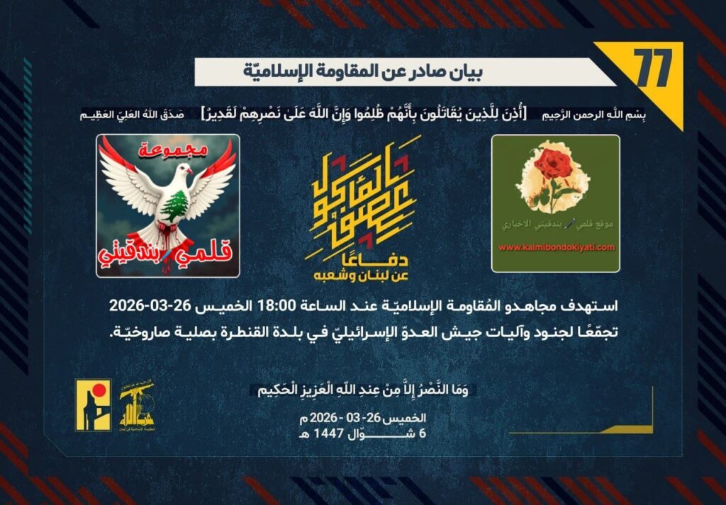 ุฏูุงุนู‹ุง ุนู† ู„ุจู†ุงู† ูˆุดุนุจู‡ุŒ ุงุณุชู‡ุฏู ู…ุฌุงู‡ุฏูˆ ุงู„ู…ูู‚ุงูˆู…ุฉ ุงู„ุฅุณู„ุงู…ูŠู‘ุฉ ุนู†ุฏ ุงู„ุณุงุนุฉ 18:00 ูŠูˆู… ุงู„ุฎู…ูŠุณ 26-03-2026 ุชุฌู…ู‘ุนู‹ุง ู„ุฌู†ูˆุฏ ูˆุขู„ูŠุงุช ุฌูŠุด ุงู„ุนุฏูˆู‘ ุงู„ุฅุณุฑุงุฆูŠู„ูŠู‘ ููŠ ุจู„ุฏุฉ ุงู„ู‚ู†ุทุฑุฉ ุจุตู„ูŠุฉ ุตุงุฑูˆุฎูŠู‘ุฉ.