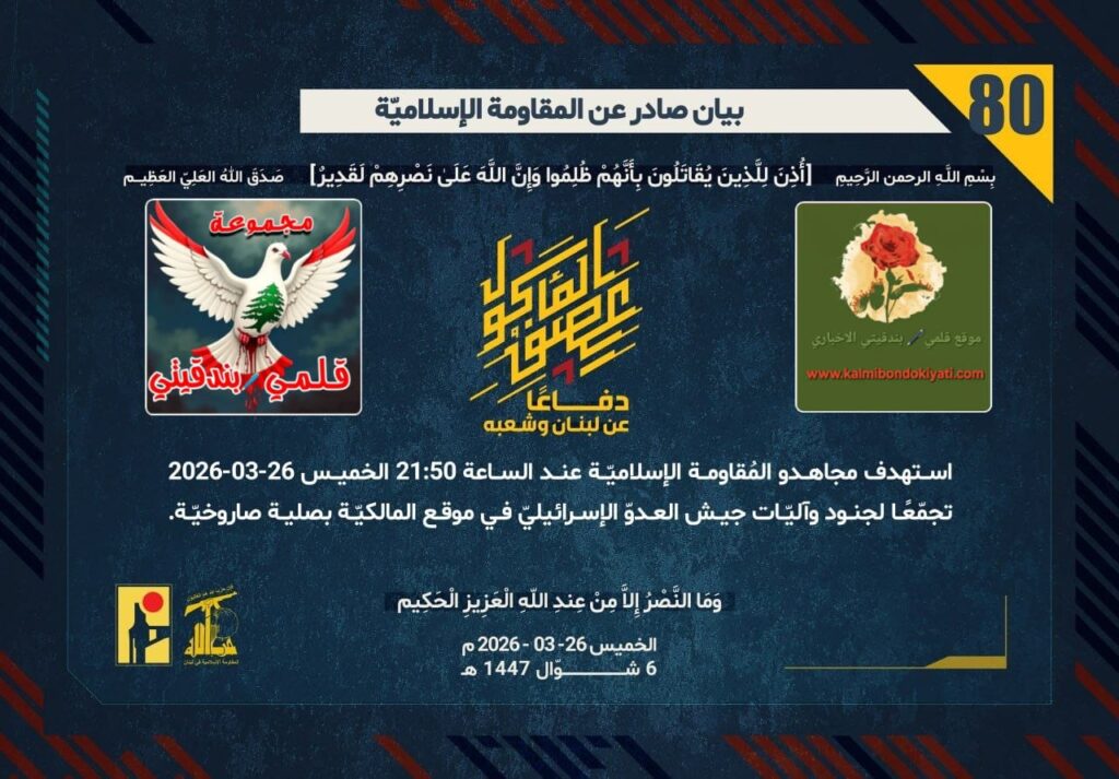 ุฏูุงุนู‹ุง ุนู† ู„ุจู†ุงู† ูˆุดุนุจู‡ุŒ ุงุณุชู‡ุฏู ู…ุฌุงู‡ุฏูˆ ุงู„ู…ูู‚ุงูˆู…ุฉ ุงู„ุฅุณู„ุงู…ูŠู‘ุฉ ุนู†ุฏ ุงู„ุณุงุนุฉ 21:50 ูŠูˆู… ุงู„ุฎู…ูŠุณ 26-03-2026 ุชุฌู…ู‘ุนู‹ุง ู„ุฌู†ูˆุฏ ูˆุขู„ูŠู‘ุงุช ุฌูŠุด ุงู„ุนุฏูˆู‘ ุงู„ุฅุณุฑุงุฆูŠู„ูŠู‘ ููŠ ู…ูˆู‚ุน ุงู„ู…ุงู„ูƒูŠู‘ุฉ ุจุตู„ูŠุฉ ุตุงุฑูˆุฎูŠู‘ุฉ.